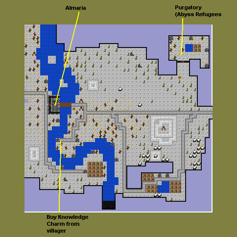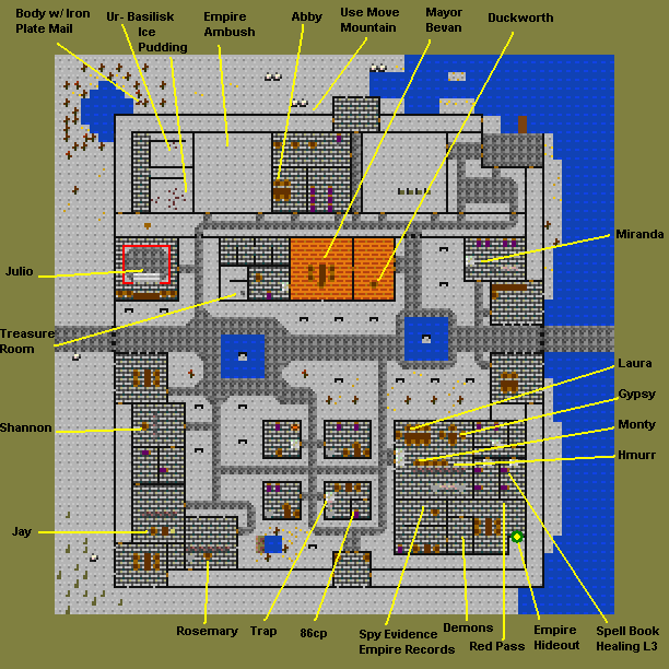 Quests Find Blue Pass - 1 rep, 10xp Find Gray Pass - 1 rep, 25xp, Priests Bracelet Find Sixus - 75xp, 4 rep, 600cp Pass Waterfall Warren - 10xp, Blessed Sandals Shops Hmurr: Innkeeper, rations, wine Jay: Armor Julio: Training Miranda: Healing Rosemary: Potions, buys stuff Shannon: Weapons, buys stuff |