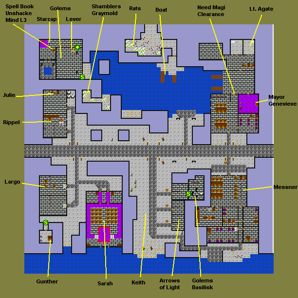 Quests Obtain Kothtar Plans - 4 rep, 30xp, 1000cp Take Ore to Dharmon - 25cp for each sack (as opposed to 18cp) Steal Surface Tools - 10xp, Strength, !-4 rep! Take healing herbs to Dharmon - 1 rep, 20xp, armor ring Shops Gunther: Tools, buys stuff Julie: Archery upplies Largo: Good potions and alchemical recipes Messner: Innkeeper Rippel: Good armor, buys stuff, Buys ore Sarah: Priest Spells |