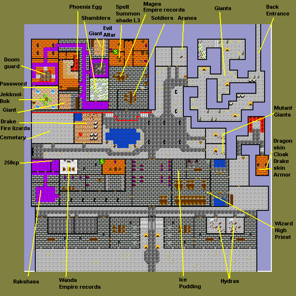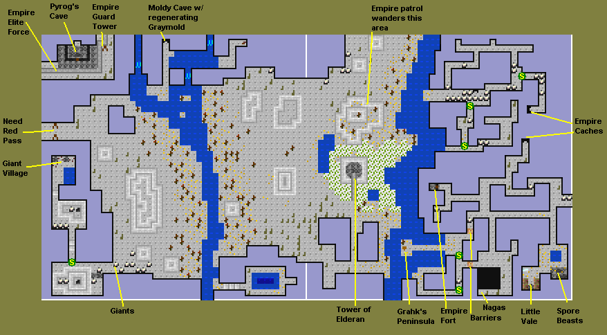 - Respawning monsters include Aranea to the east and giants and empire troops to the west.