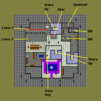 - Go north, and go into the NW room. Search for secret doors south and you'll