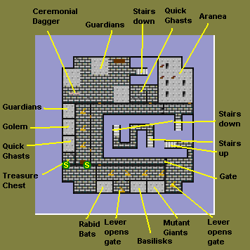 1-bats, 2- a lever, 3- basilisks, 4-mutant giants.