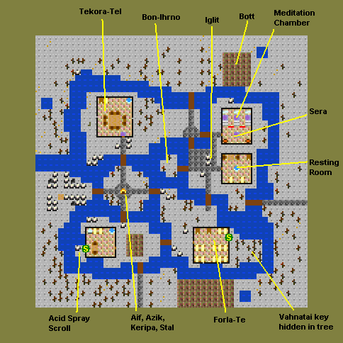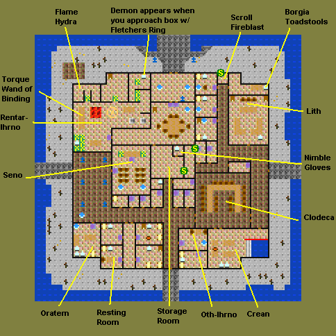 Quests: Find Drake Tooth - 25xp and Intelligence Bracelet Retrieve the Mica Tome - 20xp and the Phoenix Egg Shops: Lith: Sells crystals (unshackling, recall, piercing, stoneshatter) Oratem: Sells potions, Identification; Buys stuff Seno: Mage Spells - Capture Soul, Simulacrum |